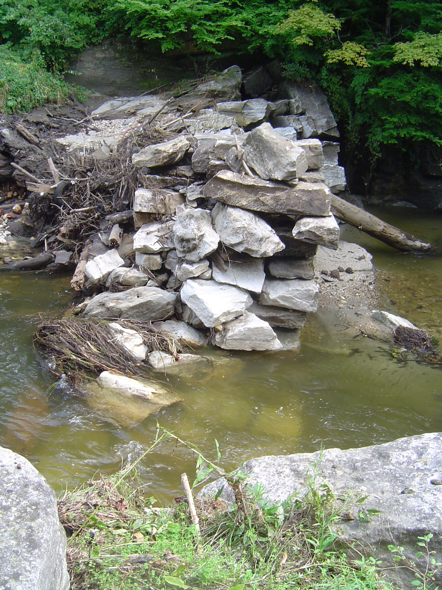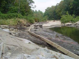 I came back to Pittsburgh for the start of the school year on Friday, August 26th, and Hurricane Irene hit Massachusetts two days later. Whereas wind damage wasn’t as heinous as expected, rain caused water levels to rise to record heights. I came back to Mass to visit the following weekend. Nearly all the shrubs along the banks of the Konkapot River behind our house had been washed away.Up the road, a hundred-plus year old damn blew out. It had created an approximately 20 foot drop, made of huge boulders. The water forced through, and resulted in a precipitous drop in the water level up stream, revealing banks and drastically changing the course of the river.