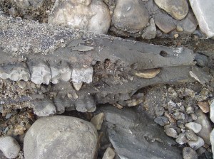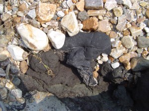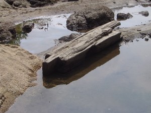 The dam had been part of one of the many old paper or saw mills that used to be along the Konkapot. The drop in the river revealed all sorts of treasures that had been submerged since the dam was put in, including an old square wooden pipe (still weighted with boulders to keep it submerged), old barn beams, leather straps and water wheels from the mills, chunks of slag (some other kind of industry happening up river?), broken pottery, bones, glass, metal, a rubber boot.
