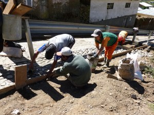 The most active place in Marcapata was on this very corner. There were always people waiting–for a collectivo, for a truck on which they could catch a ride, for a bus, for their families, to go to work, etc. etc. The next morning, a Saturday, we wandered into the plaza, but it was nearly empty. The church with its traditional thatched roof was closed up. (Every five years the town re-thatches the roof–a big celebration in the town.) Talking to people was harder than I expected because everybody was working, and the town had a little bit of a reserved feeling. We wandered up the steep slope on the south side of town, where we interviewed a store-keeper, who told us she’d like to see more tourism happening in Marcapata. That a group designated to help the town develop some sort of tourist economy came in one night and gave a power-point presentation, and that the town hadn’t received any sort of help after that for learning how implement their ideas. Around the town the landscape was beautiful–jagged, green hills with rushing rivers down in the valleys. We walked around some more and ran into a group of men who were laying stones to make a road by hand. One guy would wheelbarrow liquid cement uphill, another would pour it in between the stones with a little pitcher. One guy would hold a two-by-four at the edge to keep the cement in place. An older man sat on a little stool nearby sewing up a pair of shoes with a little puppy sleeping at his feet. This was Saturday in Marcapata.