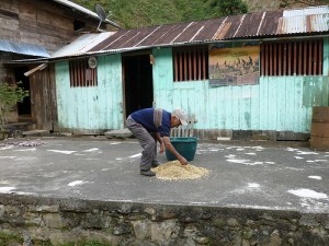 From Marcapata we descended rapidly, the air soon changing from crisp mountain air to humid jungle air. To our right the Araza River snaked through a valley, the water spreading from a single stream into braided networks criss-crossing over a rocky riverbed as the land opened up. The mountains shrank and the roadside plants grew–twelve-foot tall broad-leaved Nicotiana plants dominated the highway’s edge. Cullebrayoc isn’t really a town, but a community of a few hundred. The community holds an agricultural concession which the families all manage together, and when we arrived we found Jason’s friend, Raul Pandor, rinsing coffee beans that he’d harvested that afternoon.