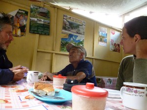 Raul invited us into his restaurant. The restaurant used to be situated back away from the road, but when the highway was paved truckers started stopping less and less in the little roadside eatery, so Raul and his family moved the structure forward. Still, they said, not nearly as many people stop that used to. Raul and his daughter, Reyna, had a much less optimistic view than the people of Marcapata–the highway wasn’t bringing positive changes to Cullebrayoc. However, a deeper weariness shrouded the Pandors–Raul’s son, Wilber, had died in a motorcycle accident nearly two years ago. Wilber’s son, Roger, lived with the Pandors in Cullebrayoc. He was a quiet, four-year-old boy who played on a bed behind the restaurant’s counter while we spoke with Raul and Reyna. His mother lived in another town. Raul served us coffee and bread, and spoke passionately–mostly to Jason–for about a half an hour. Much of his stress seemed more about the future of his crops in Cullebrayoc, who would do the work now that he was getting older. He’d lived here his entire life. Then he excused himself and headed back to work outside.