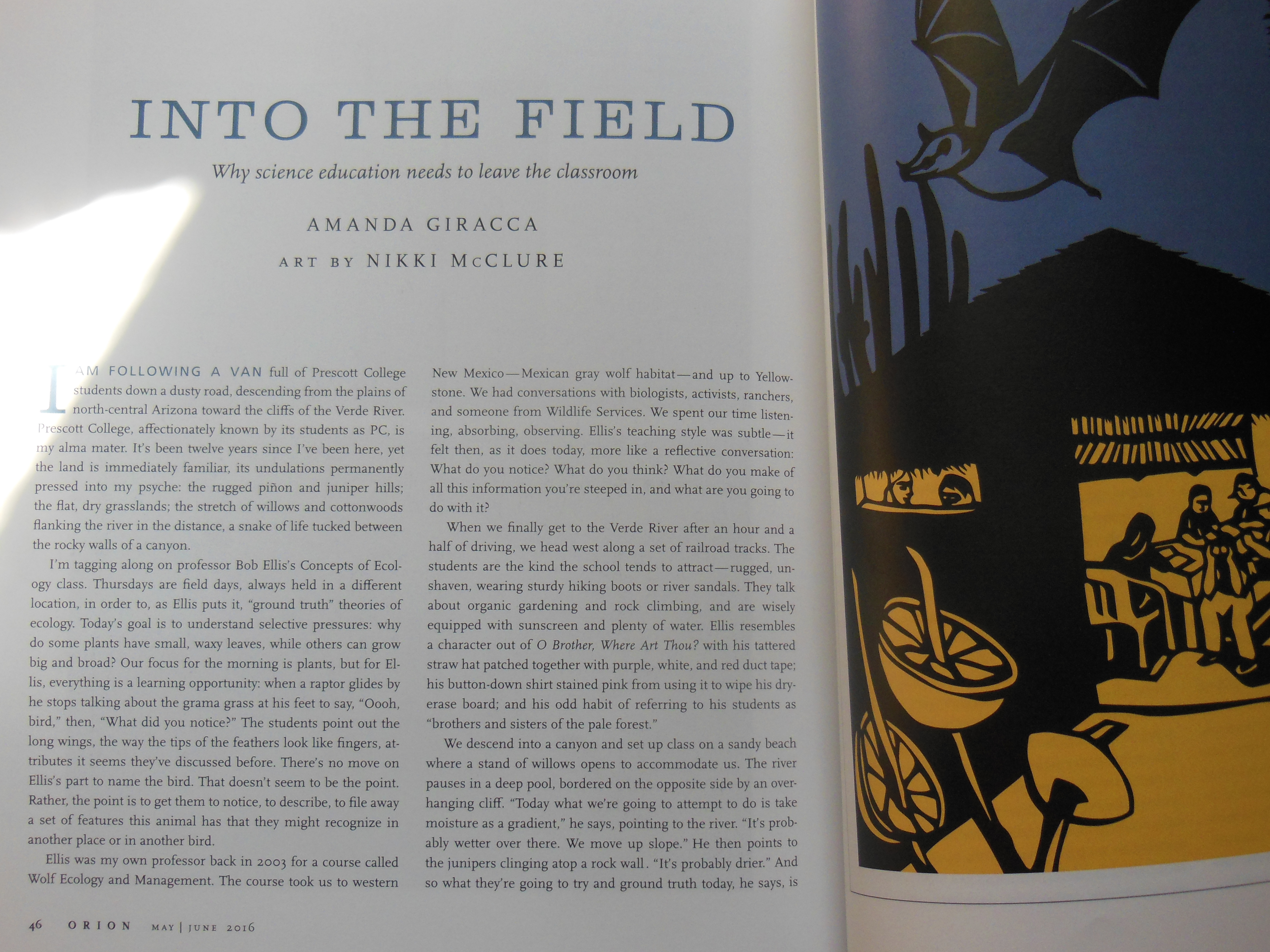 I’m tagging along on professor Bob Ellis’s Concepts of Ecology class. Thursdays are field days, always held in a different location, in order to, as Ellis puts it, “ground truth” theories of ecology. Today’s goal is to understand selective pressures: why do some plants have small, waxy leaves, while others can grow big and broad? Our focus for the morning is plants, but for Ellis, everything is a learning opportunity: when a raptor glides by he stops talking about the grama grass at his feet to say, “Oooh, bird,” then, “What did you notice?” The students point out the long wings, the way the tips of the feathers look like fingers, attributes it seems they’ve discussed before. There’s no move on Ellis’s part to name the bird. That doesn’t seem to be the point. Rather, the point is to get them to notice, to describe, to file away a set of features this animal has that they might recognize in another place or in another bird.